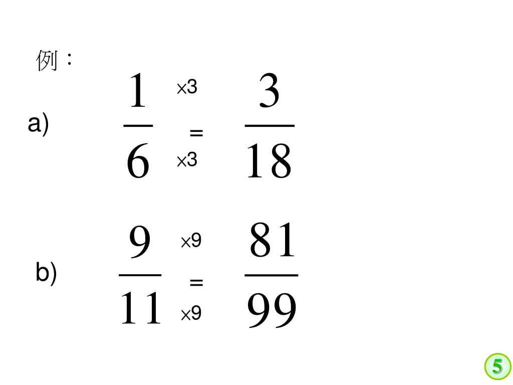 分數:擴分 • 分子和分母 同時 乘一個相同的數, • 稱為擴分; • 進行擴分時,分數原本的 數值 不會改變。 • 例如: ×5 = ×5