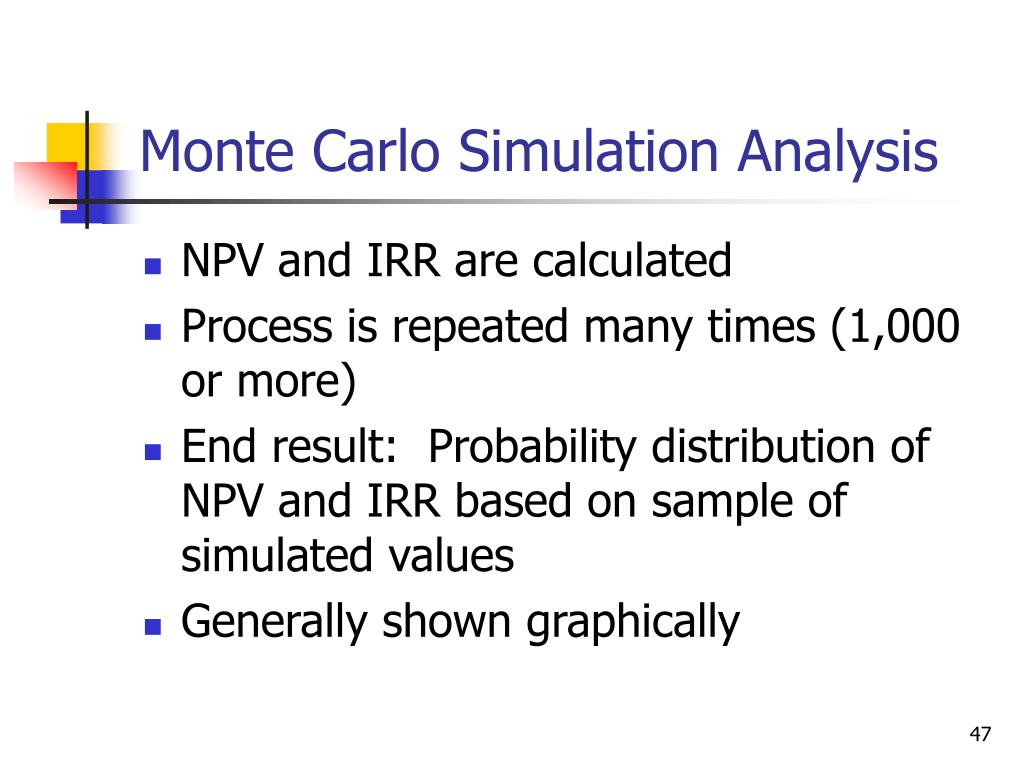 Monte Carlo Simulation Analysis • NPV and IRR are calculated • Process is repeated many times (1,000 or more) • End result: Probability distribution of NPV and IRR based on sample of simulated values • Generally shown graphically
