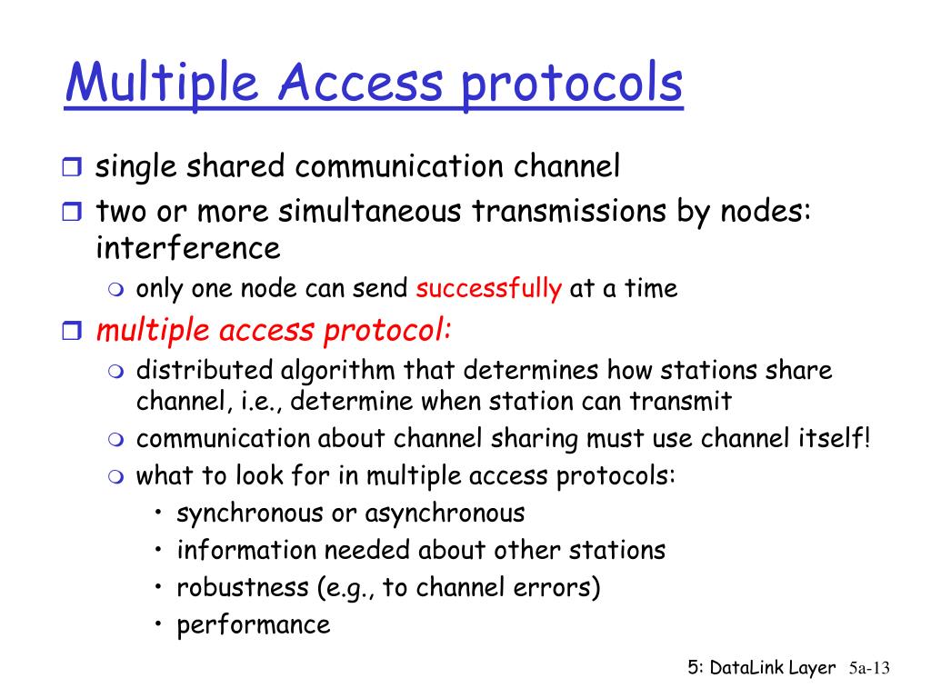 Multiple Access protocols • claim: humans use multiple access protocols all the time • class can "guess" multiple access protocols • multiaccess protocol 1: • multiaccess protocol 2: • multiaccess protocol 3: • multiaccess protocol 4: 5: DataLink Layer