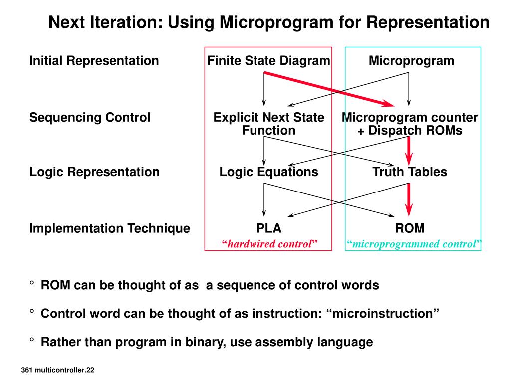 Overview • Control may be designed using one of several initial representations. The choice of sequence control, and how logic is represented, can then be determined independently; the control can then be implemented with one of several methods using a structured logic technique. Initial Representation Finite State Diagram Microprogram Sequencing Control Explicit Next State Microprogram counter Function + Dispatch ROMs Logic Representation Logic Equations Truth Tables Implementation Technique PLA ROM “hardwired control” “microprogrammed control”