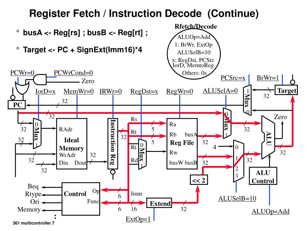 Rfetch/Decode ALUOp=Add 1: BrWr, ExtOp ALUSelB=10 x: RegDst, PCSrc IorD, MemtoReg Others: 0s Target 32 0 Mux 0 Mux 1 ALU 0 1 Mux 1 ALU Control << 2 Extend Register Fetch / Instruction Decode (Continue) • busA <- Reg[rs] ; busB <- Reg[rt] ; • Target <- PC + SignExt(Imm16)*4 PCWr=0 PCWrCond=0 PCSrc=x BrWr=1 Zero ALUSelA=0 IorD=x MemWr=0 IRWr=0 RegDst=x RegWr=0 1 Mux 32 PC 0 Zero 32 Rs Ra 32 RAdr 5 32 Rt Rb busA 32 Ideal Memory 32 Instruction Reg Reg File 5 32 4 Rt 0 Rw 32 WrAdr 32 1 32 Rd 32 Din Dout busW busB 32 2 32 3 Control Beq Op Rtype Imm 6 ALUSelB=10 Ori Func Memory 6 16 32 ALUOp=Add : ExtOp=1