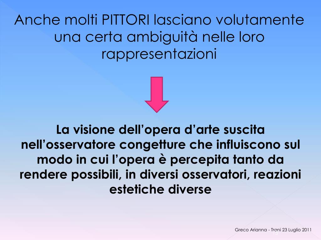 Anche molti PITTORI lasciano volutamente una certa ambiguità nelle loro rappresentazioni La visione dell’opera d’arte suscita nell’osservatore congetture che influiscono sul modo in cui l’opera è percepita tanto da rendere possibili, in diversi osservatori, reazioni estetiche diverse Greco Arianna - Trani 23 Luglio 2011