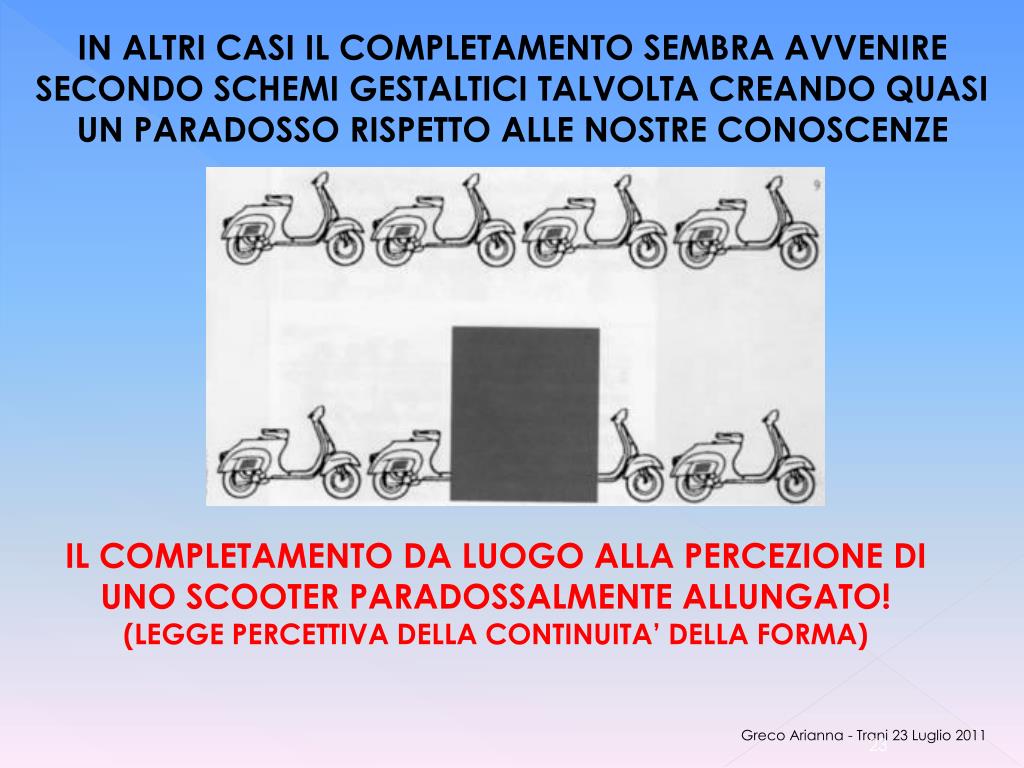 IN ALTRI CASI IL COMPLETAMENTO SEMBRA AVVENIRE SECONDO SCHEMI GESTALTICI TALVOLTA CREANDO QUASI UN PARADOSSO RISPETTO ALLE NOSTRE CONOSCENZE IL COMPLETAMENTO DA LUOGO ALLA PERCEZIONE DI UNO SCOOTER PARADOSSALMENTE ALLUNGATO! (LEGGE PERCETTIVA DELLA CONTINUITA’ DELLA FORMA) Greco Arianna - Trani 23 Luglio 2011