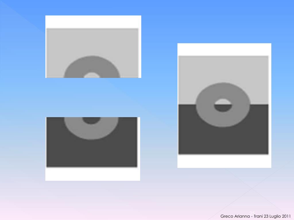 B - Importanza del CHIARO – SCURO in ciò che osserviamo Intensità dello stimolo fisico Contesto Chiaro – scuro dipende da DUE AREE FISICAMENTE UGUALI POSSONO APPARIRE L’UNA PIU’ CHIARA E L’ALTRA PIU’ SCURA SE CIRCONDATE RISPETTIVAMENTE DA UNO SFONDO PIU’ SCURO O DA UNO PIU’ CHIARO Greco Arianna - Trani 23 Luglio 2011