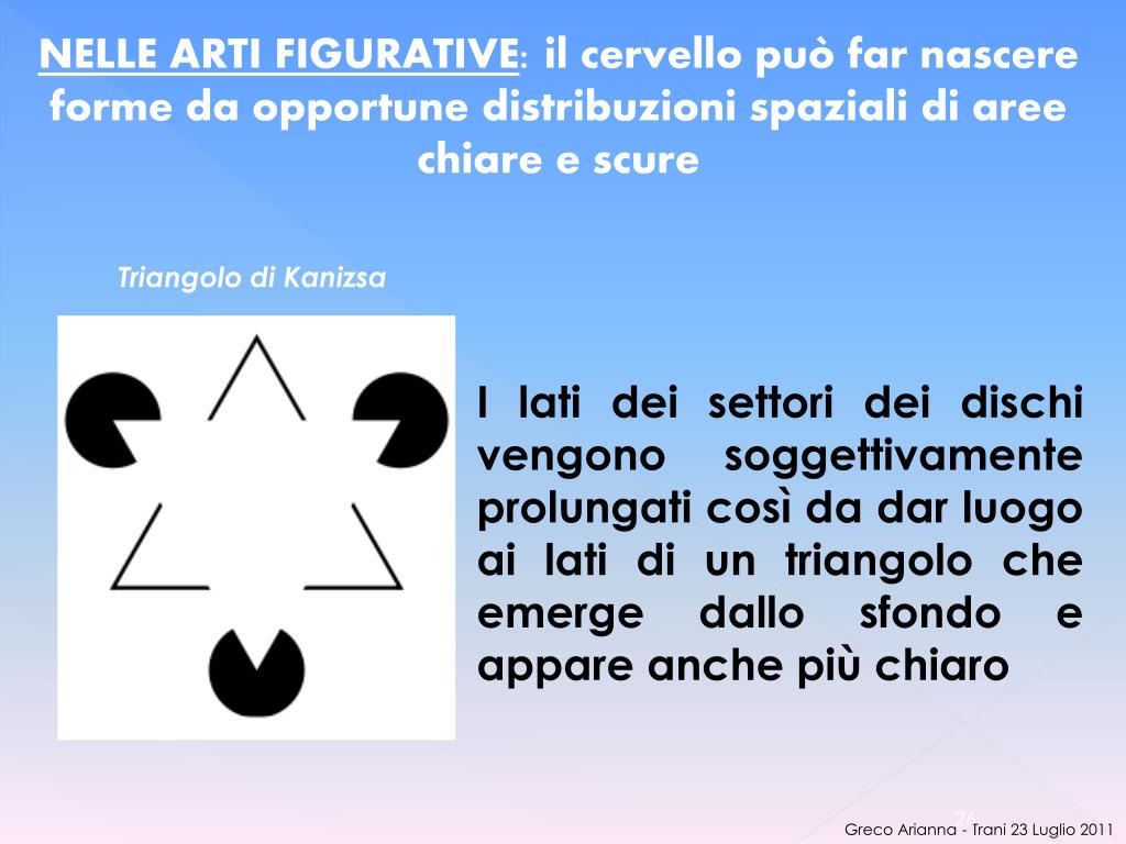 NELLE ARTI FIGURATIVE: il cervello può far nascere forme da opportune distribuzioni spaziali di aree chiare e scure Triangolo di Kanizsa I lati dei settori dei dischi vengono soggettivamente prolungati così da dar luogo ai lati di un triangolo che emerge dallo sfondo e appare anche più chiaro Greco Arianna - Trani 23 Luglio 2011