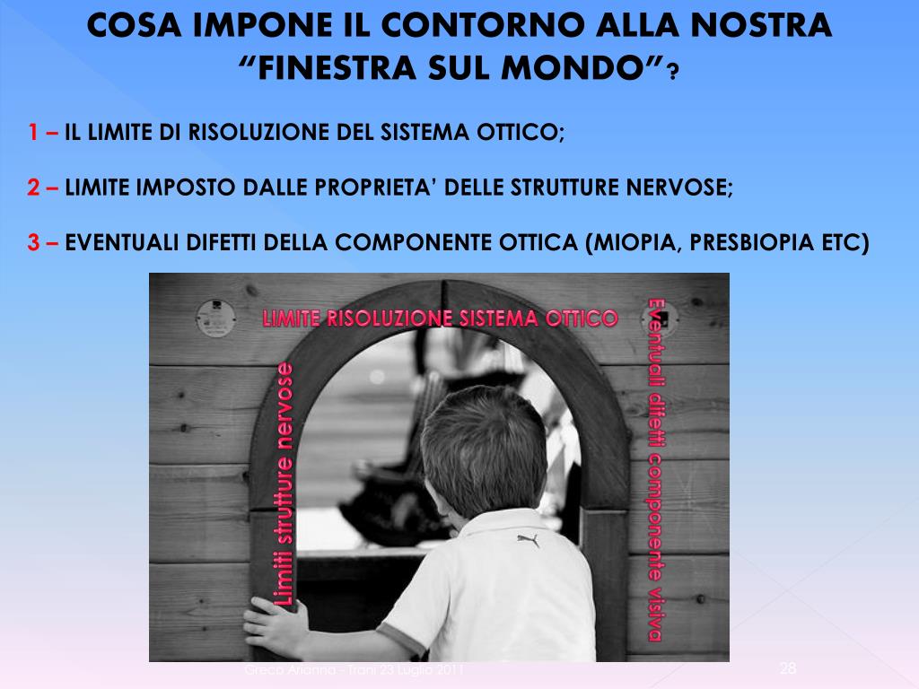 COSA IMPONE IL CONTORNO ALLA NOSTRA “FINESTRA SUL MONDO”? 1 –IL LIMITE DI RISOLUZIONE DEL SISTEMA OTTICO; 2 – LIMITE IMPOSTO DALLE PROPRIETA’ DELLE STRUTTURE NERVOSE; 3 – EVENTUALI DIFETTI DELLA COMPONENTE OTTICA (MIOPIA, PRESBIOPIA ETC) LIMITE RISOLUZIONE SISTEMA OTTICO Eventuali difetti componente visiva Limiti strutture nervose Greco Arianna - Trani 23 Luglio 2011