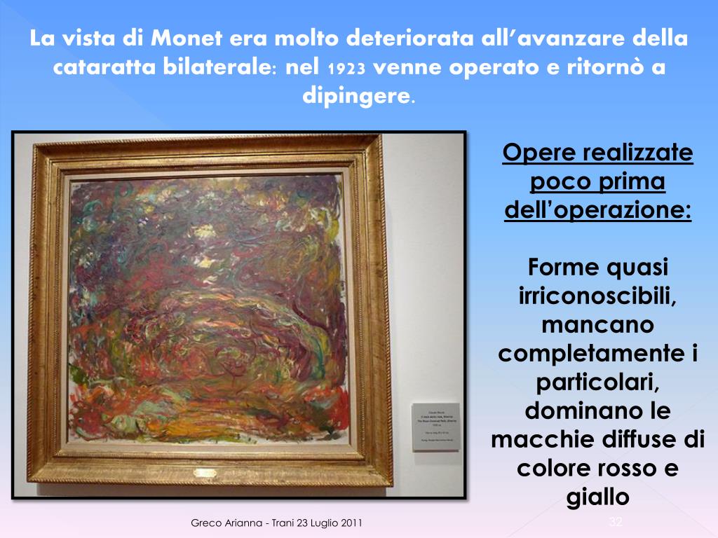 La vista di Monet era molto deteriorata all’avanzare della cataratta bilaterale: nel 1923 venne operato e ritornò a dipingere. Opere realizzate poco prima dell’operazione: Forme quasi irriconoscibili, mancano completamente i particolari, dominano le macchie diffuse di colore rosso e giallo Greco Arianna - Trani 23 Luglio 2011