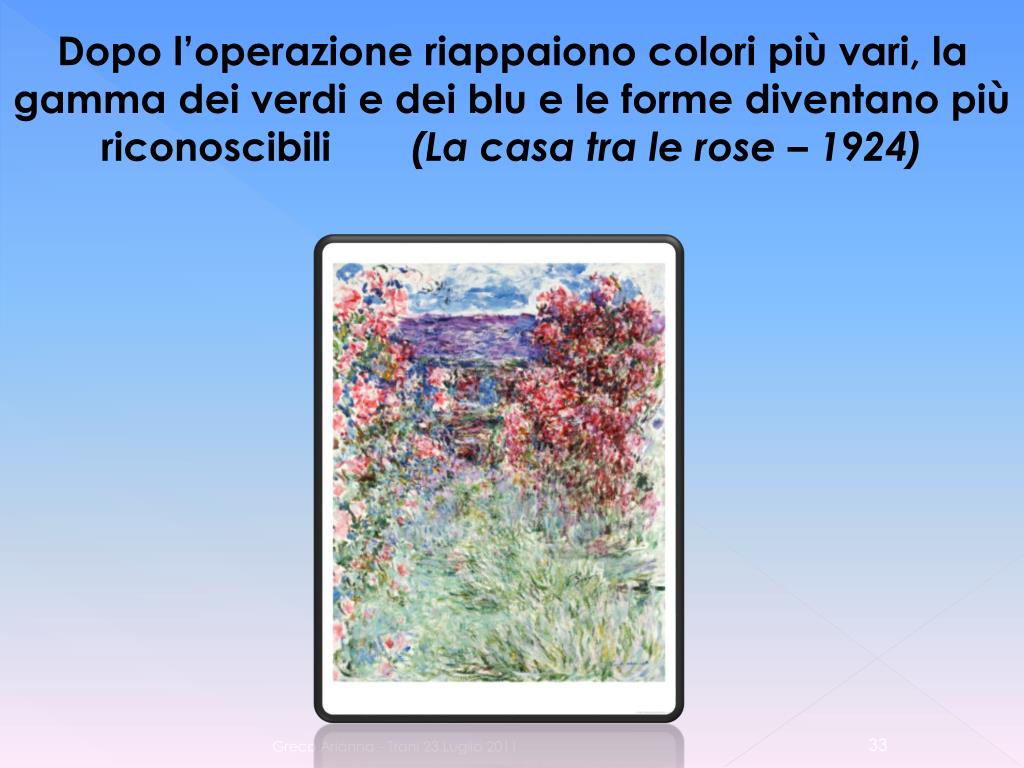 Dopo l’operazione riappaiono colori più vari, la gamma dei verdi e dei blu e le forme diventano più riconoscibili (La casa tra le rose – 1924) Greco Arianna - Trani 23 Luglio 2011
