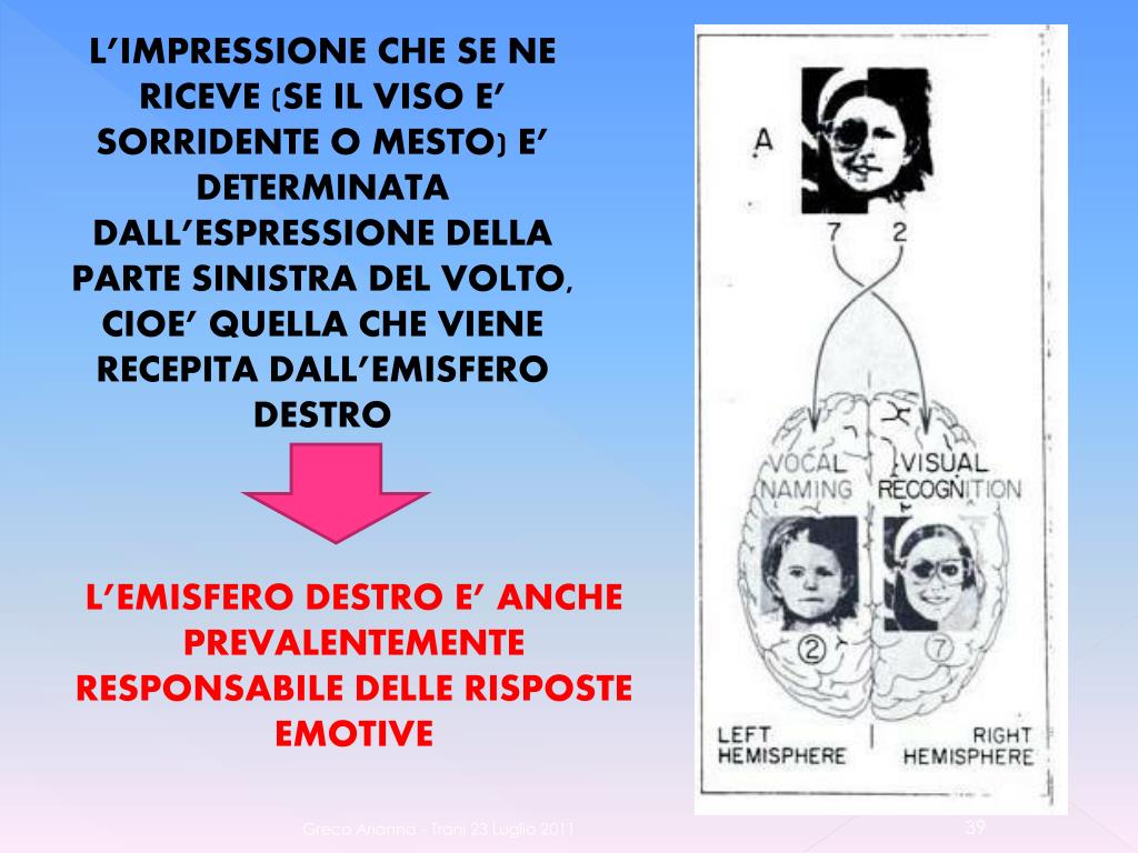 L’IMPRESSIONE CHE SE NE RICEVE (SE IL VISO E’ SORRIDENTE O MESTO) E’ DETERMINATA DALL’ESPRESSIONE DELLA PARTE SINISTRA DEL VOLTO, CIOE’ QUELLA CHE VIENE RECEPITA DALL’EMISFERO DESTRO L’EMISFERO DESTRO E’ ANCHE PREVALENTEMENTE RESPONSABILE DELLE RISPOSTE EMOTIVE Greco Arianna - Trani 23 Luglio 2011