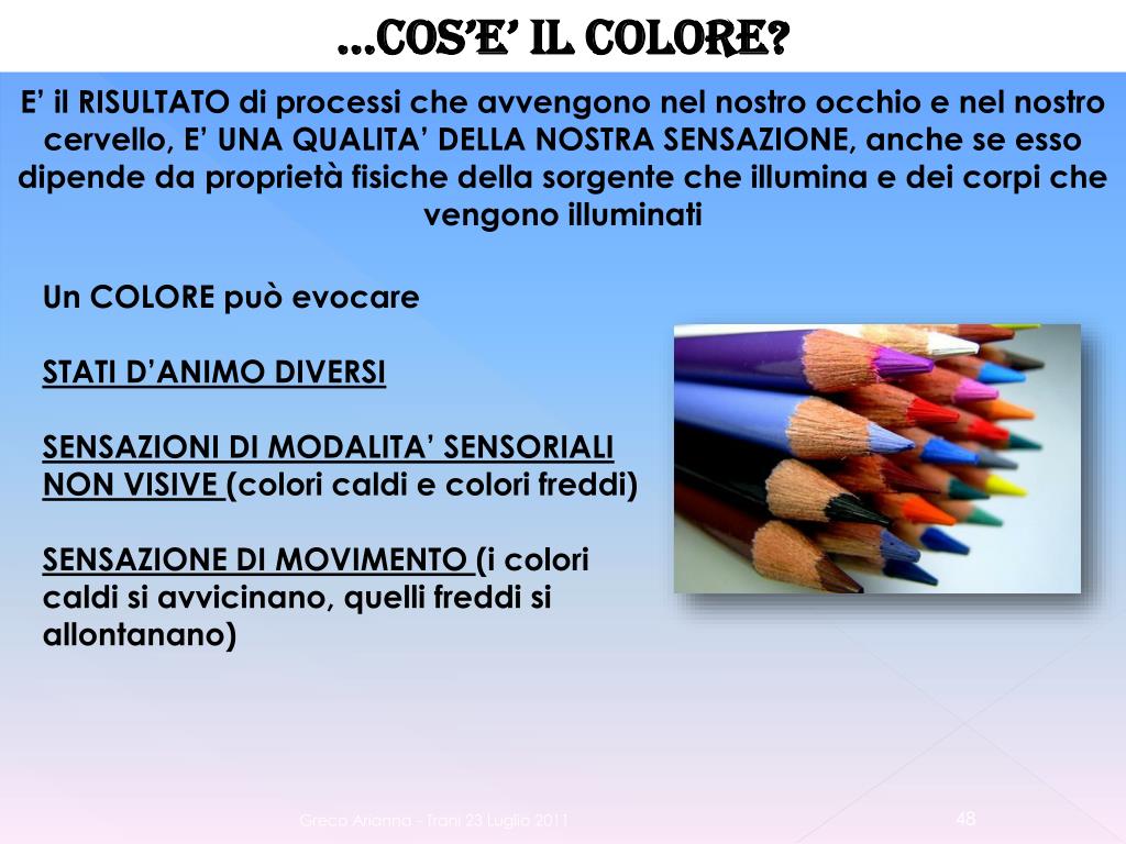 …COS’E’ IL COLORE? E’ il RISULTATO di processi che avvengono nel nostro occhio e nel nostro cervello, E’ UNA QUALITA’ DELLA NOSTRA SENSAZIONE, anche se esso dipende da proprietà fisiche della sorgente che illumina e dei corpi che vengono illuminati Un COLORE può evocare STATI D’ANIMO DIVERSI SENSAZIONI DI MODALITA’ SENSORIALI NON VISIVE (colori caldi e colori freddi) SENSAZIONE DI MOVIMENTO (i colori caldi si avvicinano, quelli freddi si allontanano) Greco Arianna - Trani 23 Luglio 2011