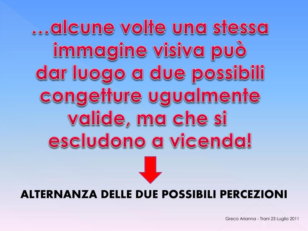 …alcune volte una stessa immagine visiva può dar luogo a due possibili congetture ugualmente valide, ma che si escludono a vicenda! ALTERNANZA DELLE DUE POSSIBILI PERCEZIONI Greco Arianna - Trani 23 Luglio 2011