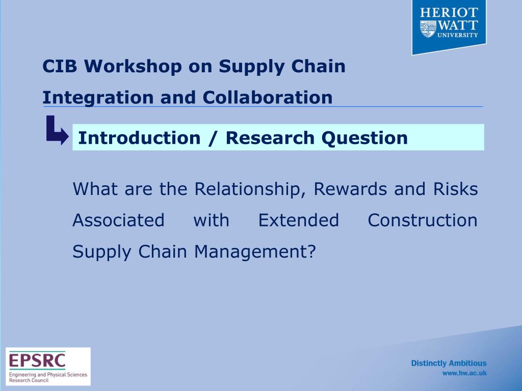 CIB Workshop on Supply Chain Integration and Collaboration Introduction / Research Question • What are the Relationship, Rewards and Risks Associated with Extended Construction Supply Chain Management?