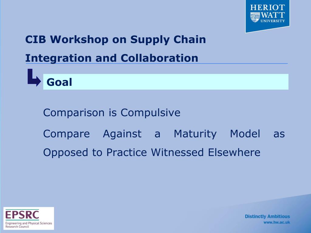 CIB Workshop on Supply Chain Integration and Collaboration Goal • Comparison is Compulsive • Compare Against a Maturity Model as Opposed to Practice Witnessed Elsewhere