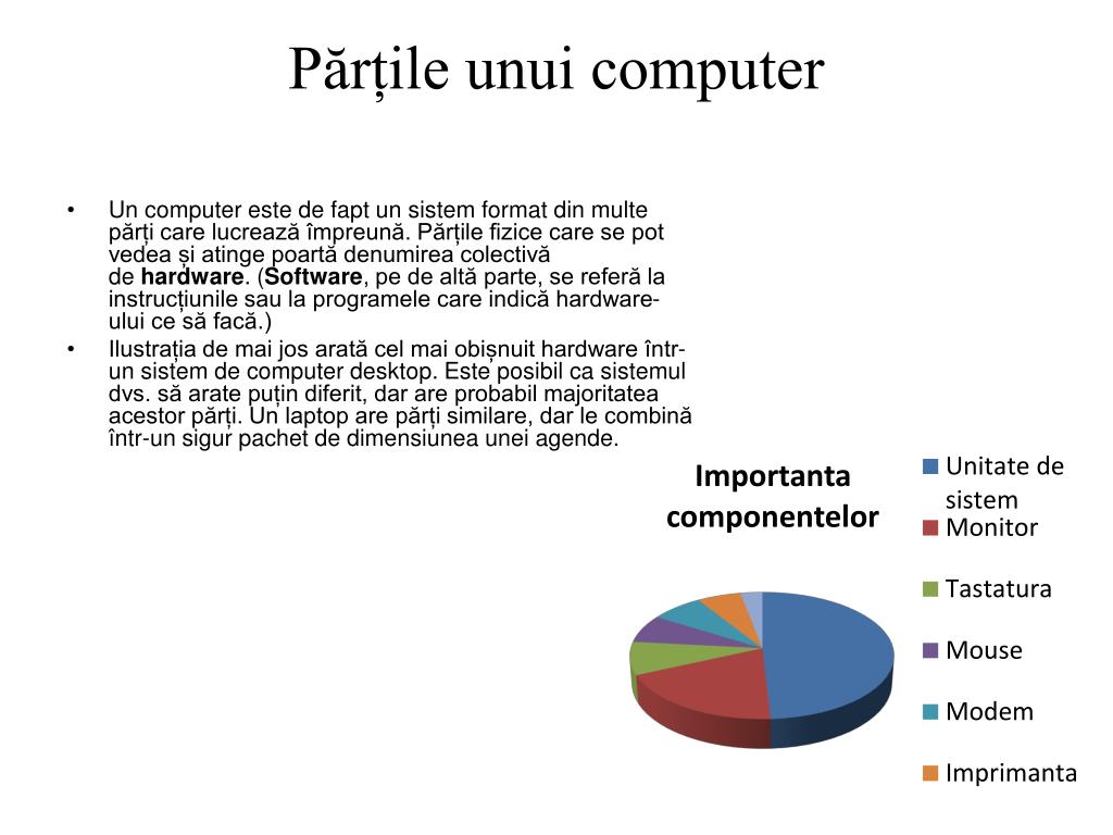 Părțile unui computer • Un computer este de fapt un sistem format din multe părți care lucrează împreună. Părțile fizice care se pot vedea și atinge poartă denumirea colectivă de hardware. (Software, pe de altă parte, se referă la instrucțiunile sau la programele care indică hardware-ului ce să facă.) • Ilustrația de mai jos arată cel mai obișnuit hardware într-un sistem de computer desktop. Este posibil ca sistemul dvs. să arate puțin diferit, dar are probabil majoritatea acestor părți. Un laptop are părți similare, dar le combină într-un sigur pachet de dimensiunea unei agende.