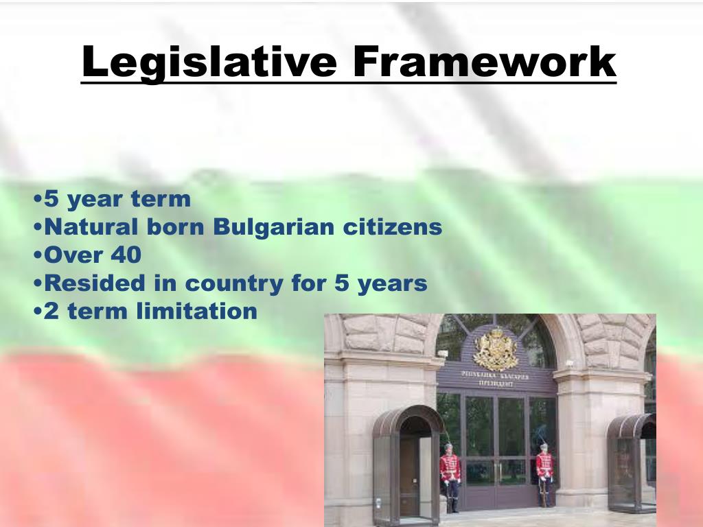 Legislative Framework • 5 year term • Natural born Bulgarian citizens • Over 40 • Resided in country for 5 years • 2 term limitation
