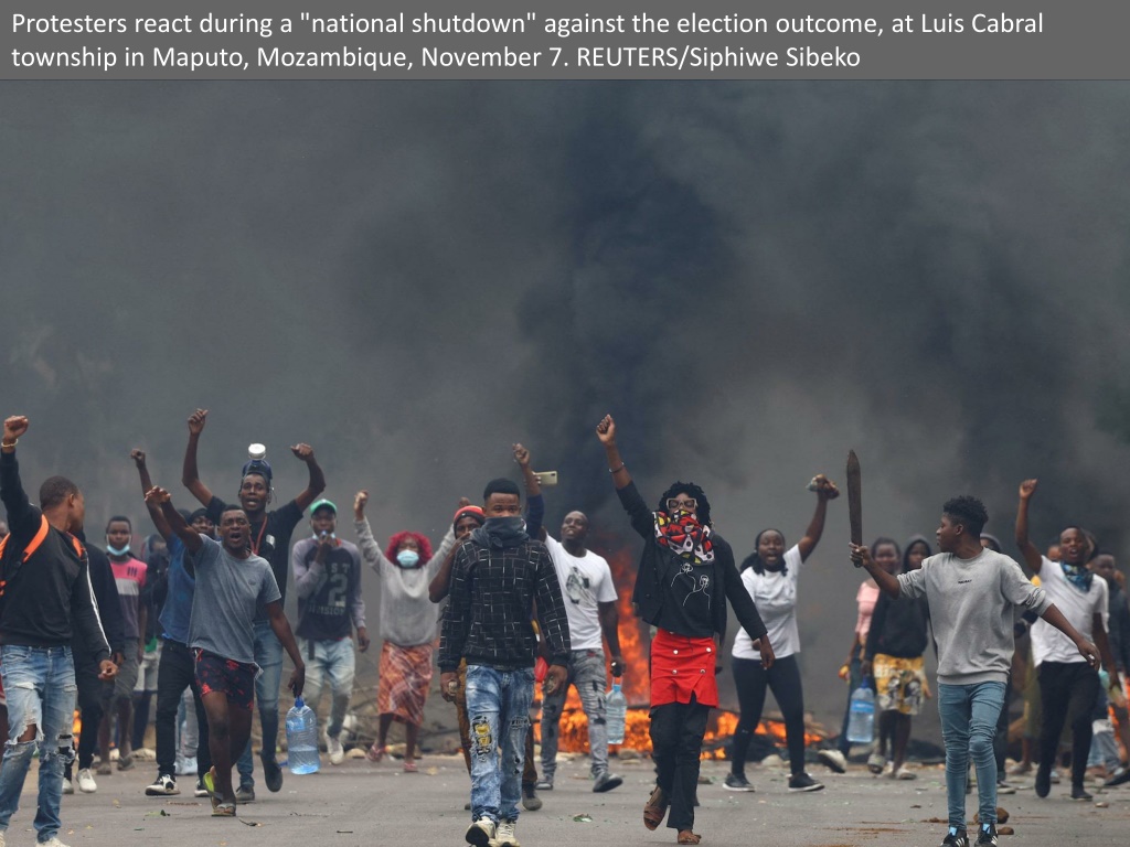 Protesters react during a "national shutdown" against the election outcome, at Luis Cabral township in Maputo, Mozambique, November 7. REUTERS/Siphiwe Sibeko
