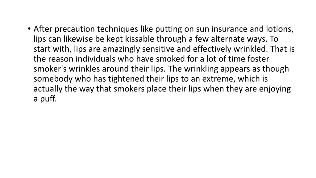 After precaution techniques like putting on sun insurance and lotions, lips can likewise be kept kissable through a few alternate ways. To start with, lips are amazingly sensitive and effectively wrinkled. That is the reason individuals who have smoked for a lot of time foster smoker's wrinkles around their lips. The wrinkling appears as though somebody who has tightened their lips to an extreme, which is actually the way that smokers place their lips when they are enjoying a puff.