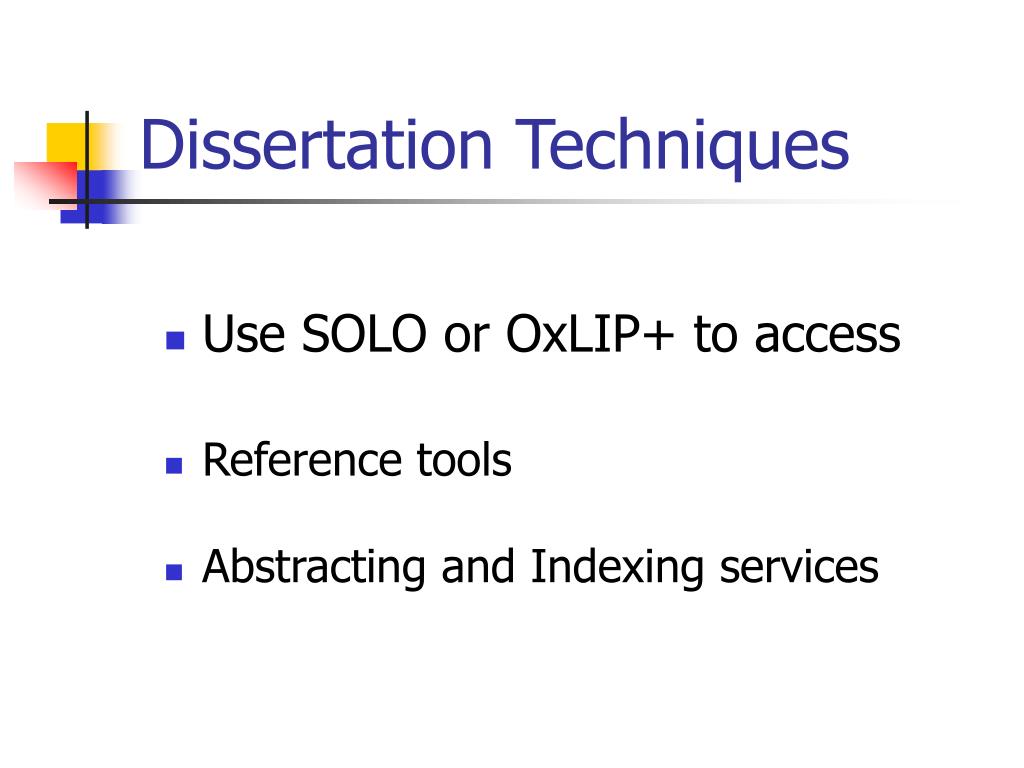 Dissertation Techniques • Use SOLO or OxLIP+ to access • Reference tools • Abstracting and Indexing services