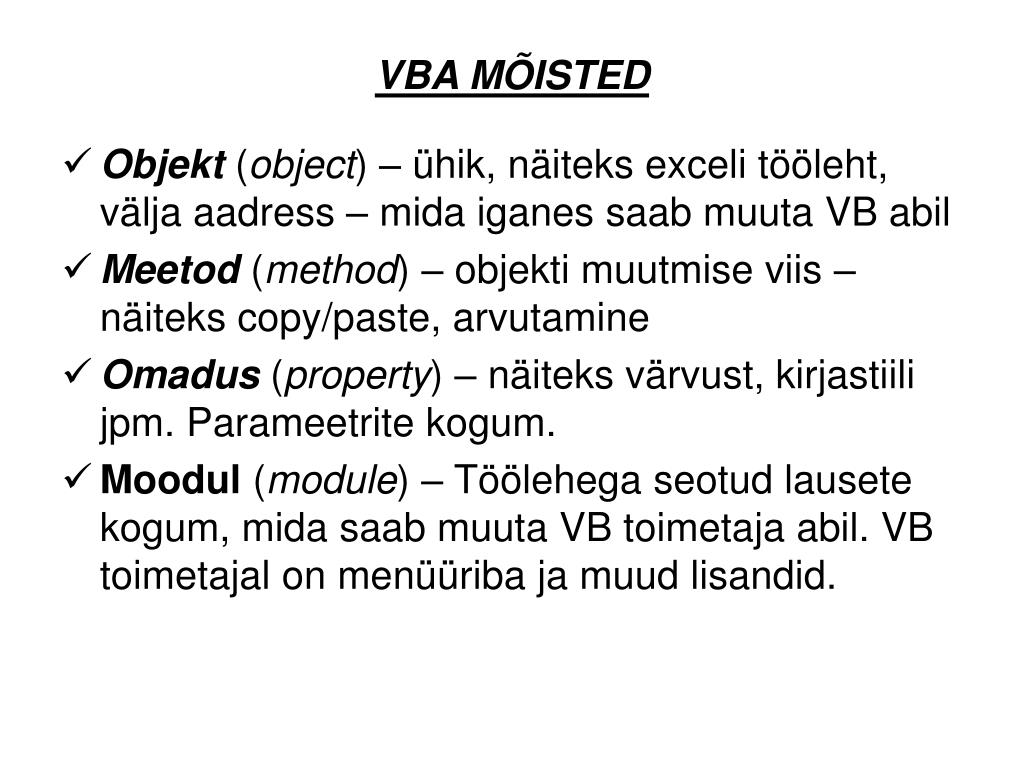 VBA MÕISTED • Objekt (object) – ühik, näiteks exceli tööleht, välja aadress – mida iganes saab muuta VB abil • Meetod (method) – objekti muutmise viis – näiteks copy/paste, arvutamine • Omadus (property) – näiteks värvust, kirjastiili jpm. Parameetrite kogum. • Moodul (module) – Töölehega seotud lausete kogum, mida saab muuta VB toimetaja abil. VB toimetajal on menüüriba ja muud lisandid.