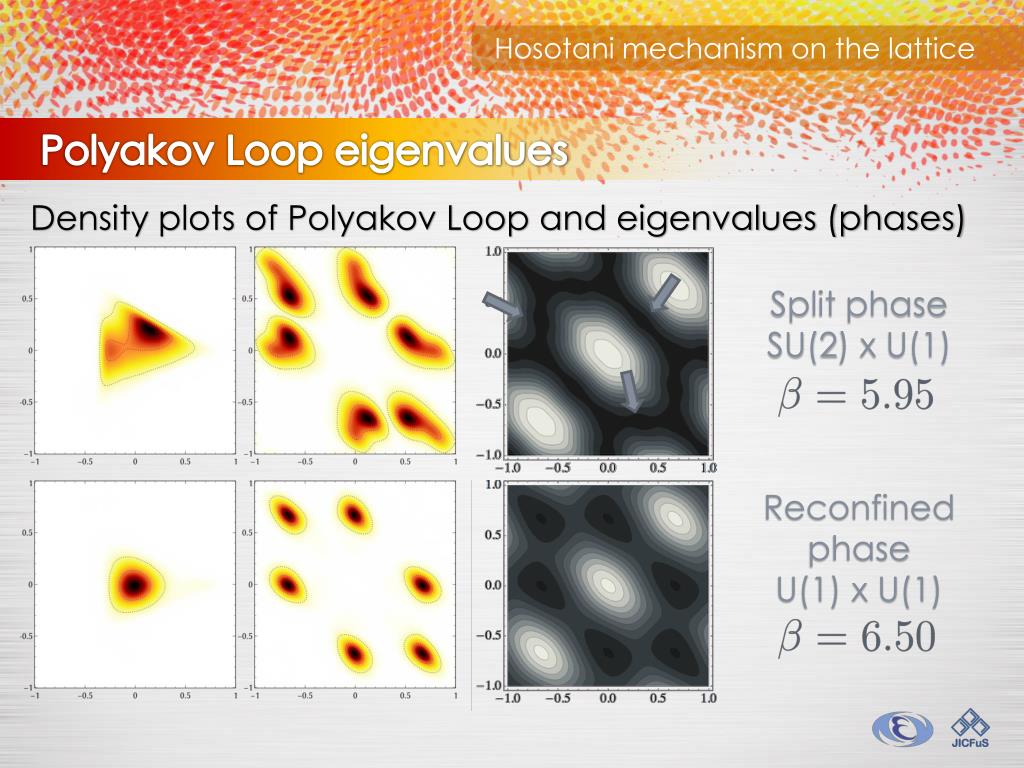 Polyakov Loop eigenvalues Density plots of Polyakov Loop and eigenvalues (phases) Split phase SU(2) x U(1) Reconfined phase U(1) x U(1)