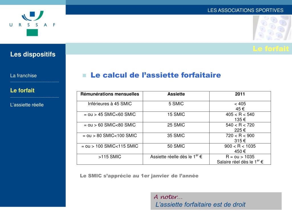 Le forfait Les dispositifs La franchise --------------------------------------------------- Le forfait --------------------------------------------------- L’assiette réelle • Le calcul de l’assiette forfaitaire Le SMIC s’apprécie au 1er janvierde l’année A noter…L’assiette forfaitaire est de droit