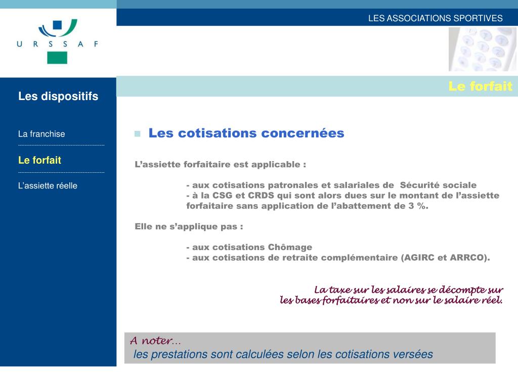 Le forfait Les dispositifs La franchise --------------------------------------------------- Le forfait --------------------------------------------------- L’assiette réelle --------------------------------------------------- Le forfait : qui peut être appliqué et éventuellement cumulé avec la franchise Les bénéficiaires : - moniteurs - éducateurs - entraîneurs sous condition de diplôme Les salariés exclus : - les moniteurs, éducateurs, professeurs… exerçant une activité autre que sportive dans ces associations, - les dirigeants et administrateurs, - les administratifs, - le personnel médical et paramédical.