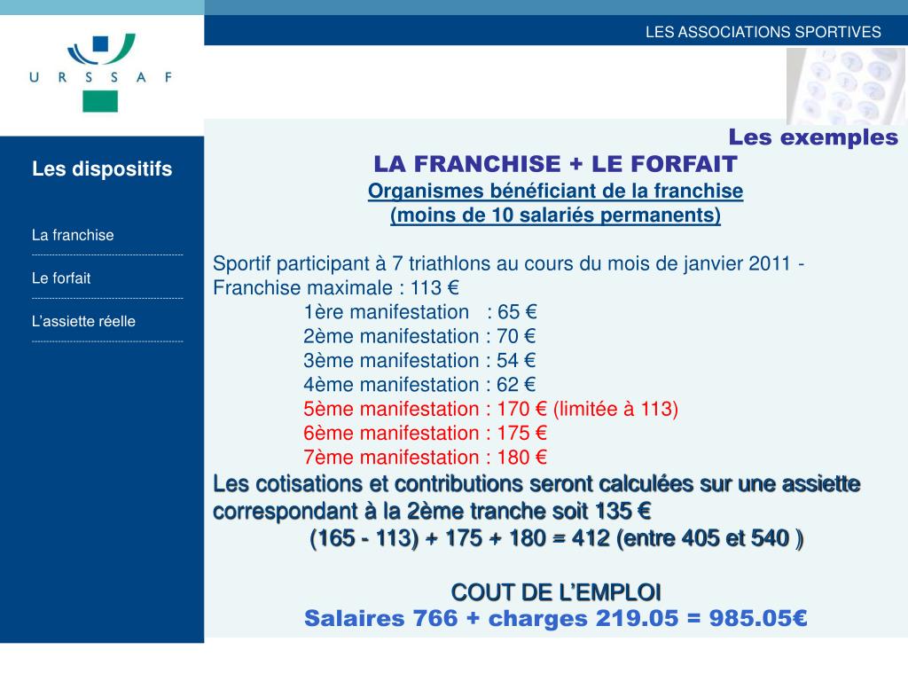 Les exemples LA FRANCHISE Organismes bénéficiant de la franchise (moins de 10 salariés permanents) Sportif participant à 4 triathlons au cours du mois de janvier 2011 - Franchise maximale : 113 € 1ère manifestation : 69 € 2ème manifestation : 71 € 3ème manifestation : 65 € 4ème manifestation : 73 € Aucune cotisation Sécurité Sociale à acquitter Les autres cotisations sont dues COUT DE L’EMPLOI Salaire 278 + 53.26 charges = 331.26 € Les dispositifs La franchise --------------------------------------------------- Le forfait --------------------------------------------------- L’assiette réelle ---------------------------------------------------