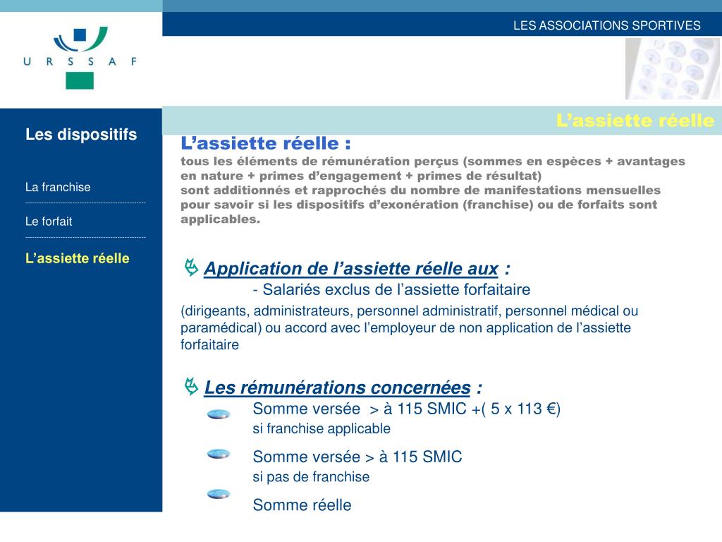 L’assiette réelle Les dispositifs La franchise --------------------------------------------------- Le forfait --------------------------------------------------- L’assiette réelle L’assiette réelle : tous les éléments de rémunération perçus (sommes en espèces + avantages en nature + primes d’engagement + primes de résultat)sont additionnés et rapprochés du nombre de manifestations mensuelles pour savoir si les dispositifs d’exonération (franchise) ou de forfaits sont applicables. Application de l’assiette réelle aux: - Salariés exclus de l’assiette forfaitaire (dirigeants, administrateurs, personnel administratif, personnel médical ou paramédical) ou accord avec l’employeur de non application de l’assiette forfaitaire Les rémunérations concernées : Somme versée > à 115 SMIC +( 5 x 113 €) si franchise applicable Somme versée > à 115 SMIC si pas de franchise Somme réelle