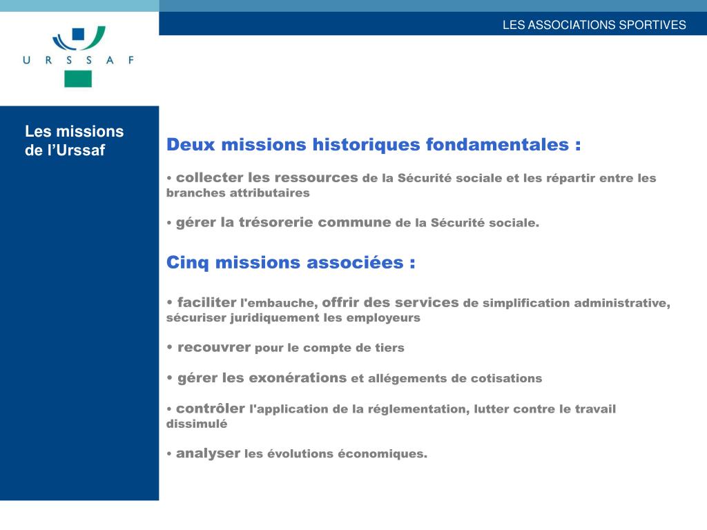 LES ASSOCIATIONS SPORTIVES. 1.2.3…. AU SOMMAIRE Les missions de l’URSSAF La répartition des cotisations Les acteurs Les dispositifs Les cas particuliers Les remboursements de frais Les avantages en nature Les offres de service Les contacts. Deux missions historiques fondamentales :