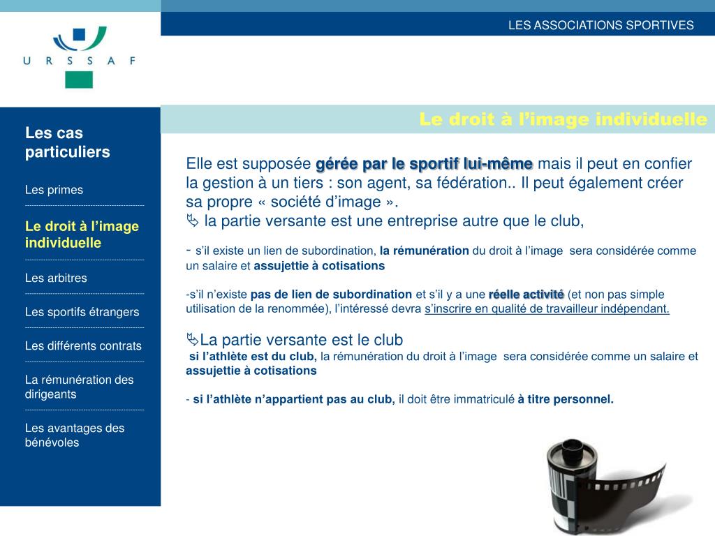 Le droit à l’image individuelle Les cas particuliers Les primes --------------------------------------------------- Le droit à l’image individuelle --------------------------------------------------- Les arbitres --------------------------------------------------- Les sportifs étrangers --------------------------------------------------- Les différents contrats --------------------------------------------------- La rémunération des dirigeants --------------------------------------------------- Les avantages des bénévoles • Elle est supposée gérée par le sportif lui-même mais il peut en confier la gestion à un tiers : son agent, sa fédération.. Il peut également créer sa propre « société d’image ». • la partie versante est une entreprise autre que le club, • s’il existe un lien de subordination, la rémunération du droit à l’image sera considérée comme un salaire et assujettie à cotisations • s’il n’existe pas de lien de subordination et s’il y a une réelle activité (et non pas simple utilisation de la renommée), l’intéressé devra s’inscrire en qualité de travailleur indépendant. • La partie versante est le club si l’athlète est du club, la rémunération du droit à l’image sera considérée comme un salaire et assujettie à cotisations • si l’athlète n’appartient pas au club, il doit être immatriculé à titre personnel.