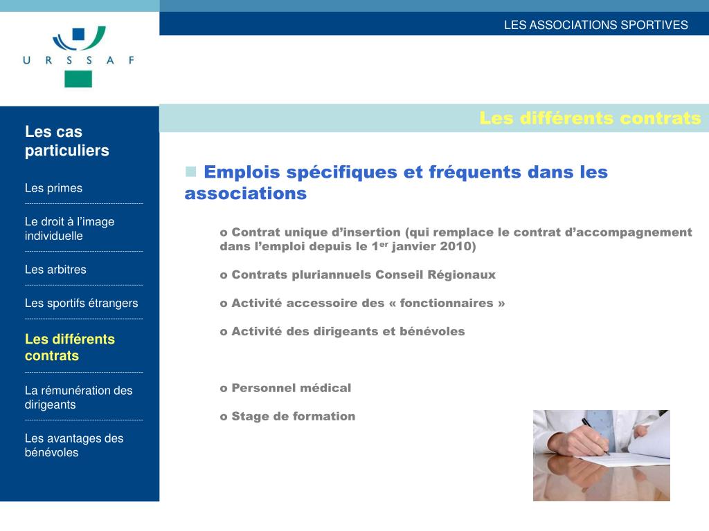Les différents contrats Les cas particuliers Les primes --------------------------------------------------- Le droit à l’image individuelle --------------------------------------------------- Les arbitres --------------------------------------------------- Les sportifs étrangers --------------------------------------------------- Les différents contrats --------------------------------------------------- La rémunération des dirigeants --------------------------------------------------- Les avantages des bénévoles • Emplois spécifiques et fréquents dans les associations • Contrat unique d’insertion (qui remplace le contrat d’accompagnement dans l’emploi depuis le 1er janvier 2010) • Contrats pluriannuels Conseil Régionaux • Activité accessoire des « fonctionnaires » • Activité des dirigeants et bénévoles • Personnel médical • Stage de formation