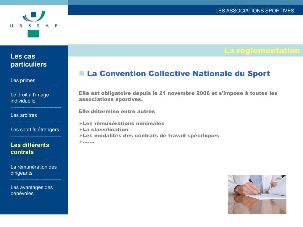 La réglementation Les cas particuliers Les primes --------------------------------------------------- Le droit à l’image individuelle --------------------------------------------------- Les arbitres --------------------------------------------------- Les sportifs étrangers --------------------------------------------------- Les différents contrats --------------------------------------------------- La rémunération des dirigeants --------------------------------------------------- Les avantages des bénévoles • La Convention Collective Nationale du Sport • Elle est obligatoire depuis le 21 novembre 2006 et s’impose à toutes les associations sportives. • Elle détermine entre autres • Les rémunérations minimales • La classification • Les modalités des contrats de travail spécifiques • …….