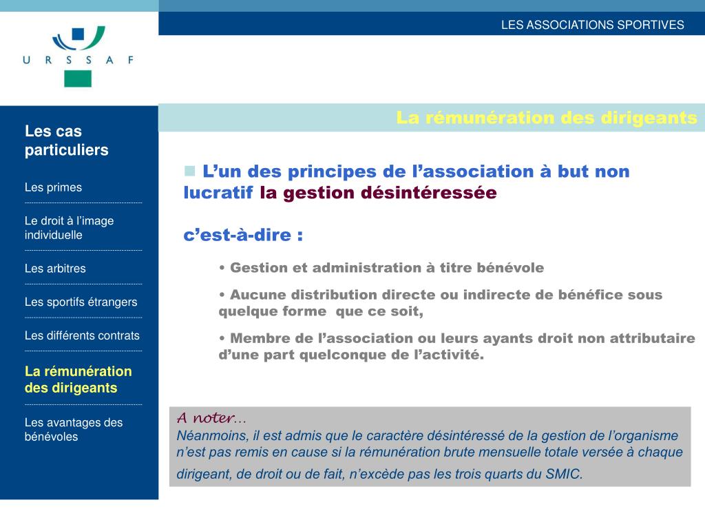 La rémunération des dirigeants Les cas particuliers Les primes --------------------------------------------------- Le droit à l’image individuelle --------------------------------------------------- Les arbitres --------------------------------------------------- Les sportifs étrangers --------------------------------------------------- Les différents contrats --------------------------------------------------- La rémunération des dirigeants --------------------------------------------------- Les avantages des bénévoles • L’un des principes de l’association à but non lucratif la gestion désintéressée c’est-à-dire : • Gestion et administration à titre bénévole • Aucune distribution directe ou indirecte de bénéfice sous quelque forme que ce soit, • Membre de l’association ou leurs ayants droit non attributaire d’une part quelconque de l’activité. A noter…Néanmoins, il est admis que le caractère désintéressé de la gestion de l’organisme n’est pas remis en cause si la rémunération brute mensuelle totale versée à chaque dirigeant, de droit ou de fait, n’excède pas les trois quarts du SMIC.