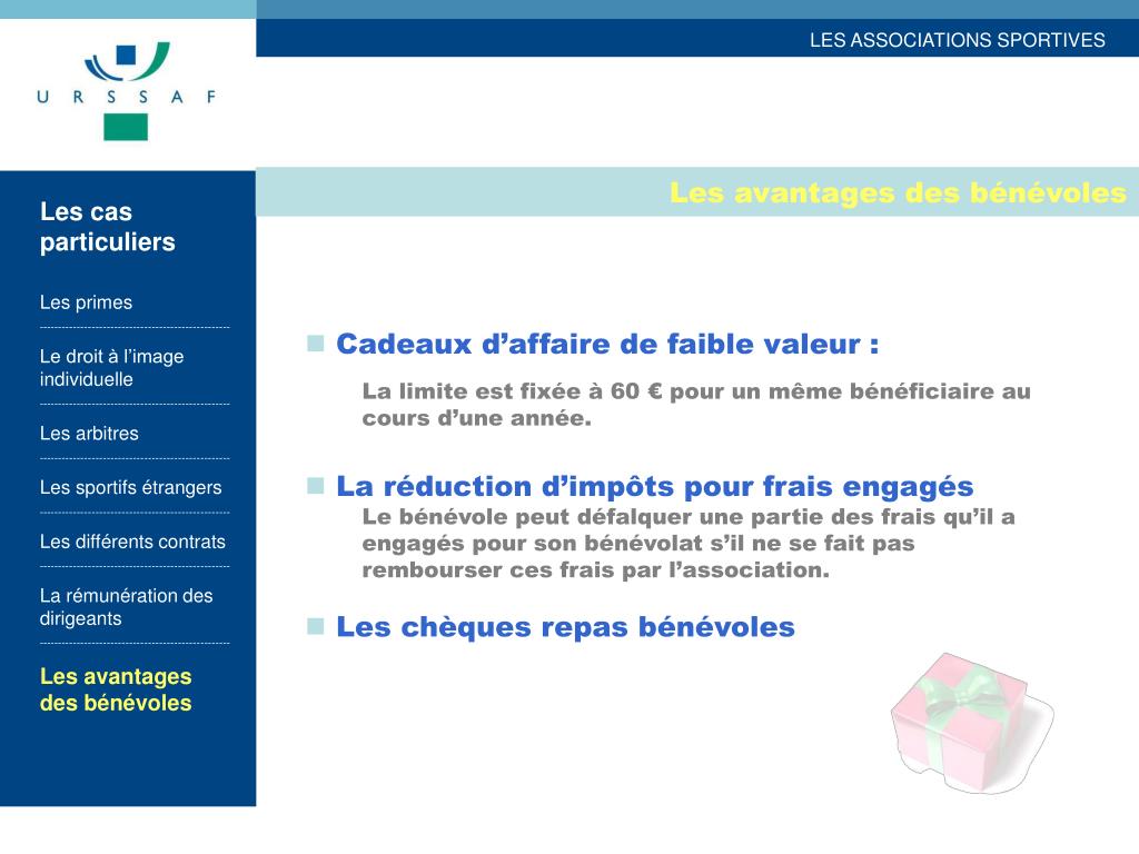 Les avantages des bénévoles Les cas particuliers Les primes --------------------------------------------------- Le droit à l’image individuelle --------------------------------------------------- Les arbitres --------------------------------------------------- Les sportifs étrangers --------------------------------------------------- Les différents contrats --------------------------------------------------- La rémunération des dirigeants --------------------------------------------------- Les avantages des bénévoles • Cadeaux d’affaire de faible valeur : • La limite est fixée à 60 € pour un même bénéficiaire au cours d’une année. • La réduction d’impôts pour frais engagés Le bénévole peut défalquer une partie des frais qu’il a engagés pour son bénévolat s’il ne se fait pas rembourser ces frais par l’association. • Les chèques repas bénévoles
