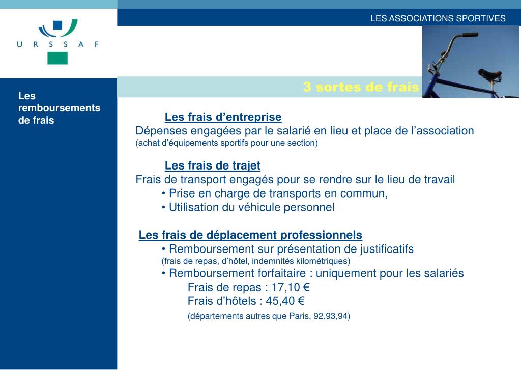 3 sortes de frais Les remboursements de frais • Les frais d’entreprise • Dépenses engagées par le salarié en lieu et place de l’association(achat d’équipements sportifs pour une section) • Les frais de trajet • Frais de transport engagés pour se rendre sur le lieu de travail • Prise en charge de transports en commun, • Utilisation du véhicule personnel • Les frais de déplacement professionnels • Remboursement sur présentation de justificatifs (frais de repas, d’hôtel, indemnités kilométriques) • Remboursement forfaitaire : uniquement pour les salariés • Frais de repas : 17,10 € • Frais d’hôtels : 45,40 € (départements autres que Paris, 92,93,94)