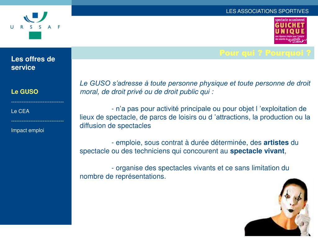 Pour qui ? Pourquoi ? Les offres de service Le GUSO ------------------------------ Le CEA ------------------------------ Impact emploi Le GUSO s’adresse à toute personne physique et toute personne de droit moral, de droit privé ou de droit public qui : - n’a pas pour activité principale ou pour objet l ’exploitation de lieux de spectacle, de parcs de loisirs ou d ’attractions, la production ou la diffusion de spectacles - emploie, sous contrat à durée déterminée, des artistes du spectacle ou des techniciens qui concourent au spectacle vivant, - organise des spectacles vivants et ce sans limitation du nombre de représentations.