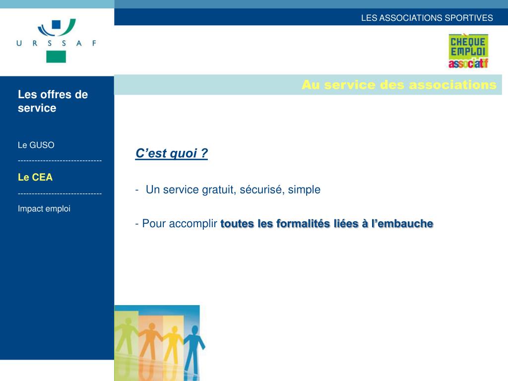 Au service des associations Les offres de service Le GUSO ------------------------------ Le CEA ------------------------------ Impact emploi • C’est quoi ? • Un service gratuit, sécurisé, simple • - Pour accomplir toutes les formalités liées à l’embauche