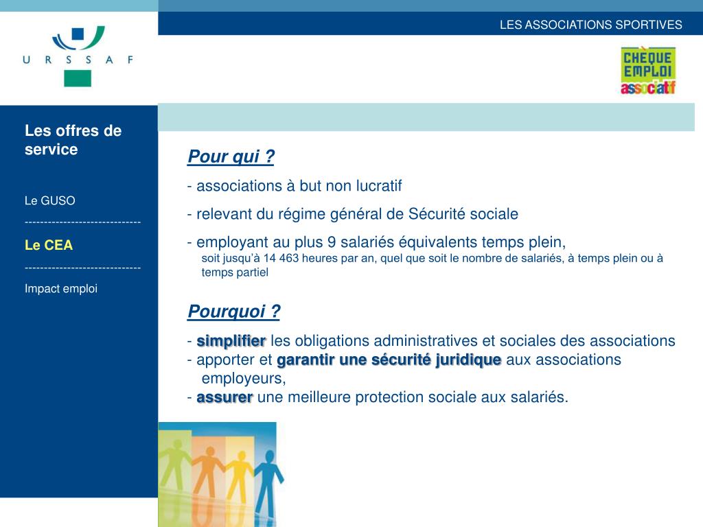 Les offres de service Le GUSO ------------------------------ Le CEA ------------------------------ Impact emploi Pour qui ? - associations à but non lucratif - relevant du régime général de Sécurité sociale - employant au plus 9 salariés équivalents temps plein, soit jusqu’à 14 463 heures par an, quel que soit le nombre de salariés, à temps plein ou à temps partiel Pourquoi ? - simplifier les obligations administratives et sociales des associations - apporter et garantir une sécurité juridique aux associations employeurs, - assurer une meilleure protection sociale aux salariés.