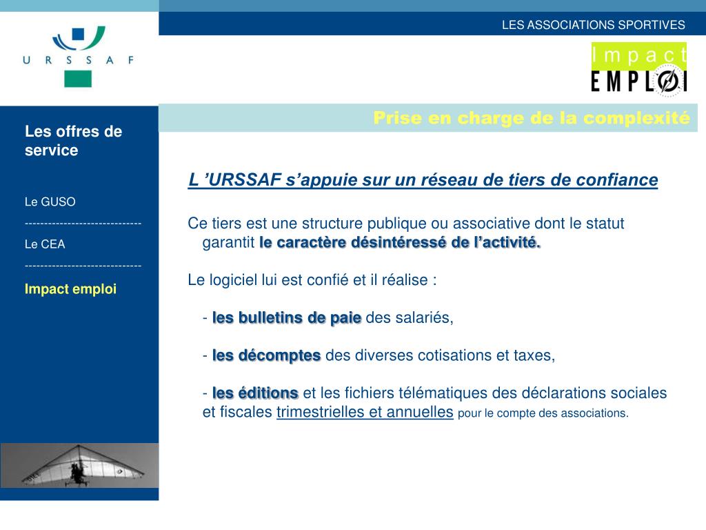 Prise en charge de la complexité Les offres de service Le GUSO ------------------------------ Le CEA ------------------------------ Impact emploi L ’URSSAF s’appuie sur un réseau de tiers de confiance Ce tiers est une structure publique ou associative dont le statut garantit le caractère désintéressé de l’activité. Le logiciel lui est confié et il réalise : - les bulletins de paie des salariés, - les décomptes des diverses cotisations et taxes, - les éditions et les fichiers télématiques des déclarations sociales et fiscales trimestrielles et annuellespour le compte des associations.