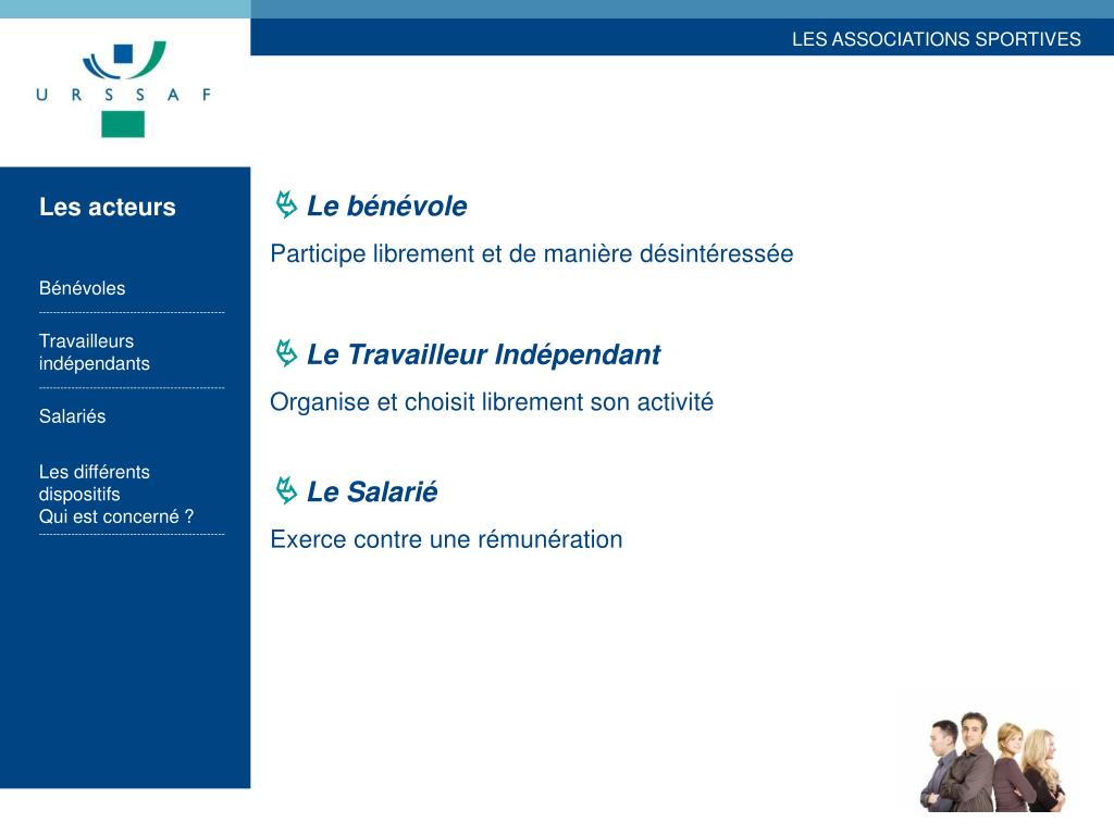Les acteurs Bénévoles --------------------------------------------------- Travailleurs indépendants --------------------------------------------------- Salariés Les différents dispositifs Qui est concerné ? --------------------------------------------------- Les différents dispositifs Des dispositions particulières (franchise de cotisations, assiettes forfaitaires) sont applicables pour certaines personnes intervenant au sein de l’association sportive Qui est concerné ? Lesassociations : - affiliées à une fédération sportive - agréées par le Ministère chargé des Sports