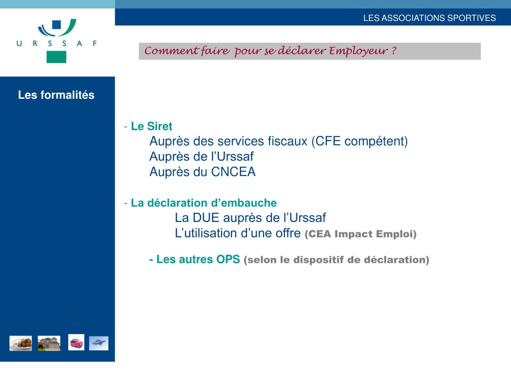 Comment faire pour se déclarer Employeur ? Les formalités • Le Siret • Auprès des services fiscaux (CFE compétent) • Auprès de l’Urssaf • Auprès du CNCEA • La déclaration d’embauche • La DUE auprès de l’Urssaf • L’utilisation d’une offre (CEA Impact Emploi) • - Les autres OPS (selon le dispositif de déclaration)