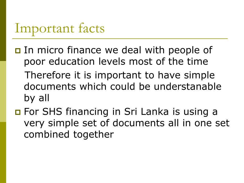 Important facts • In micro finance we deal with people of poor education levels most of the time Therefore it is important to have simple documents which could be understanable by all • For SHS financing in Sri Lanka is using a very simple set of documents all in one set combined together