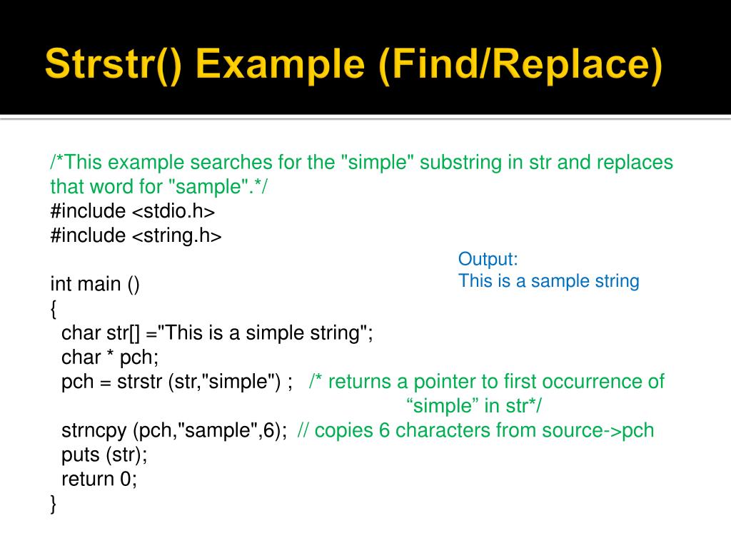 Strstr() Example (Find/Replace) /*This example searches for the "simple" substring in str and replaces that word for "sample".*/ #include <stdio.h> #include <string.h> int main () { char str[] ="This is a simple string"; char * pch; pch = strstr (str,"simple") ; /* returns a pointer to first occurrence of “simple” in str*/ strncpy (pch,"sample",6); // copies 6 characters from source->pch puts (str); return 0; } Output: This is a sample string