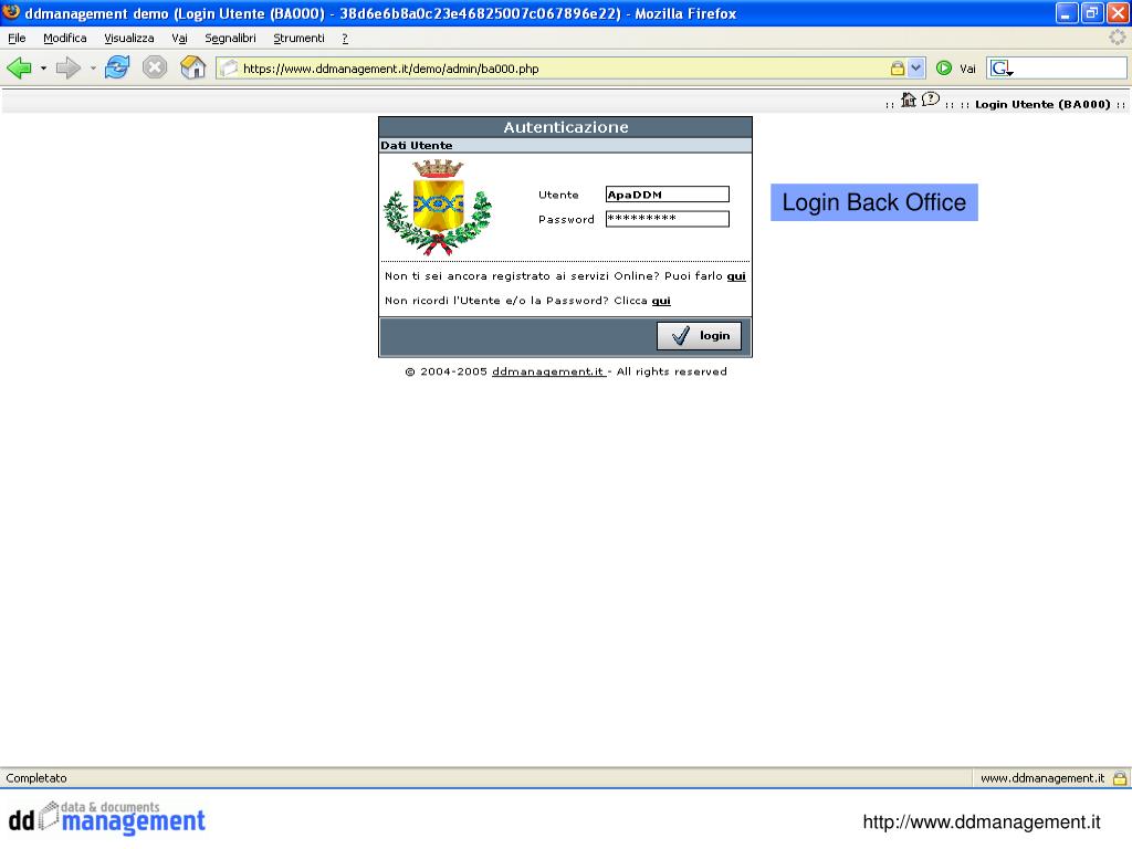 Utilizzo DDMFramework per il contribuente registrato sul portale dei tributi Nella demo si fa riferimento ad un contribuente che ha presentato la Dichiarazione di variazione ICI nel 2005, ha effettuato, per il 2005 dei pagamenti con i tradizionali bollettini di CC Postale e che nel 2006 desidera pagare on line l'imposta ICI utilizzando il portale dei tributi. Nella slide che segue il contribuente effettua il login al sistema. http://www.ddmanagement.it