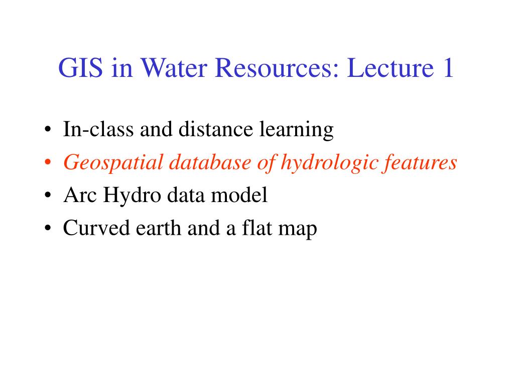 GIS in Water Resources: Lecture 1 • In-class and distance learning • Geospatial database of hydrologic features • Arc Hydro data model • Curved earth and a flat map
