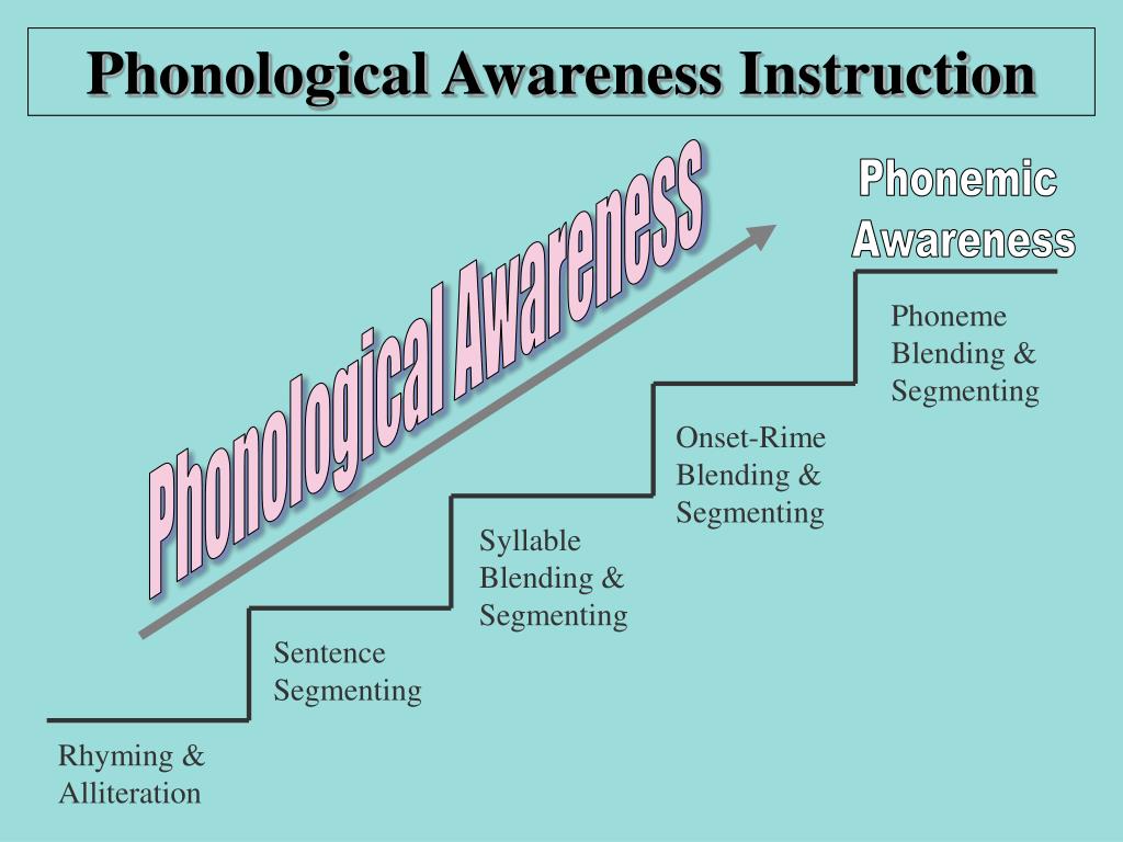 Phonological Awareness Instruction Phonological Awareness Phonemic Awareness Phoneme Blending & Segmenting Onset-Rime Blending & Segmenting Syllable Blending & Segmenting Sentence Segmenting Rhyming & Alliteration