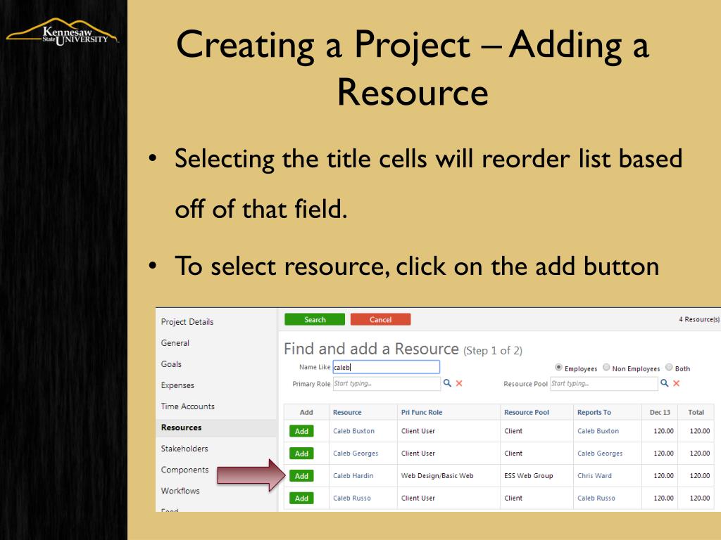 Creating a Project – Adding a Resource • Selecting the title cells will reorder list based off of that field. • To select resource, click on the add button