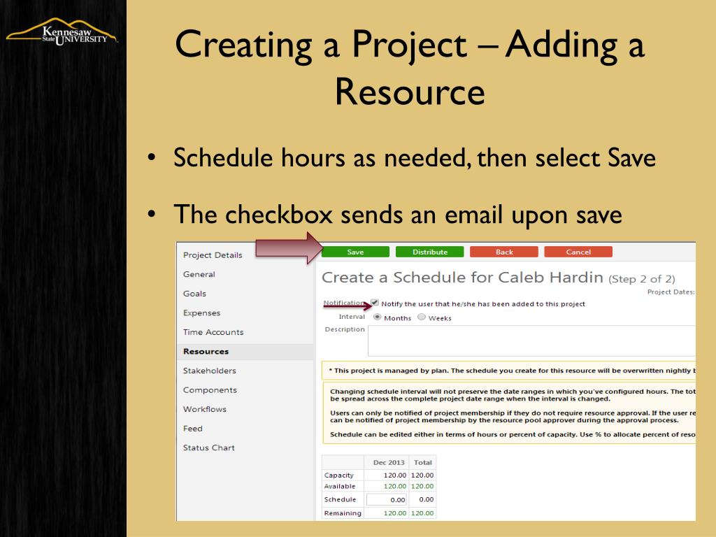 Creating a Project – Adding a Resource • Schedule hours as needed, then select Save • The checkbox sends an email upon save