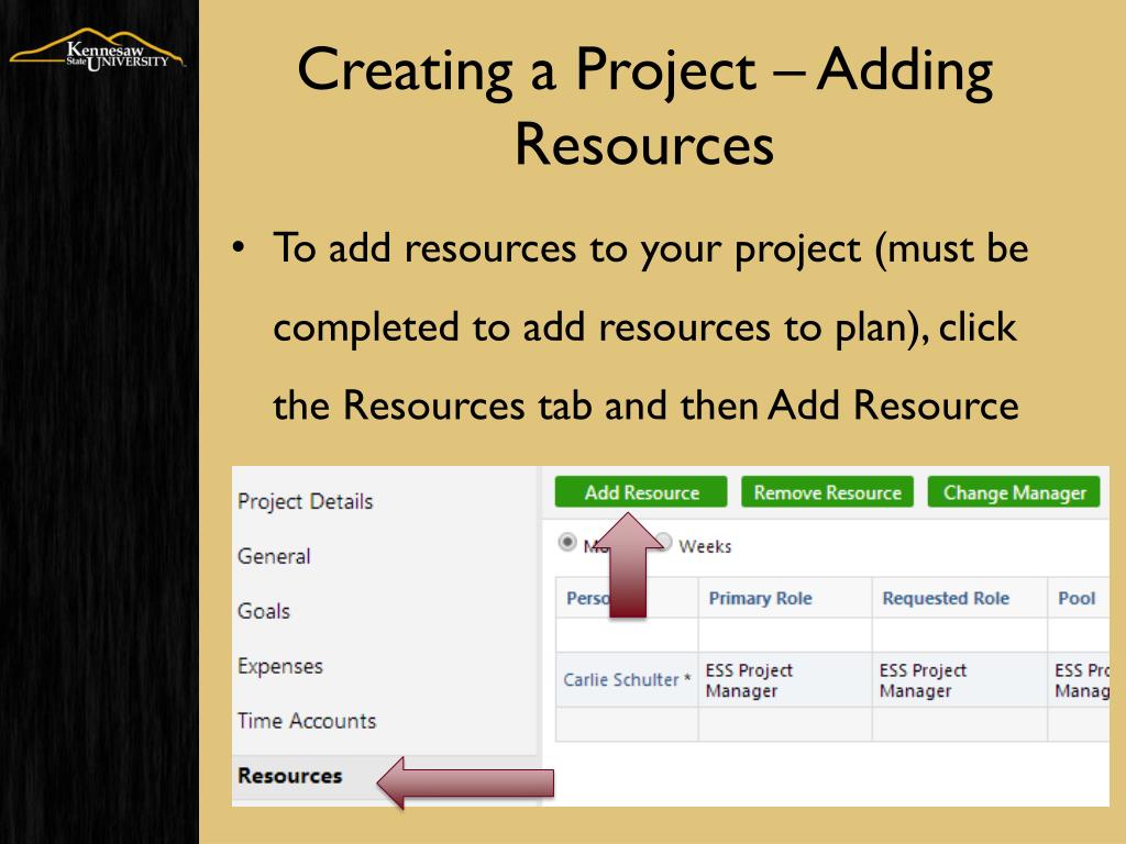 Creating a Project – Adding Resources • To add resources to your project (must be completed to add resources to plan), click the Resources tab and then Add Resource