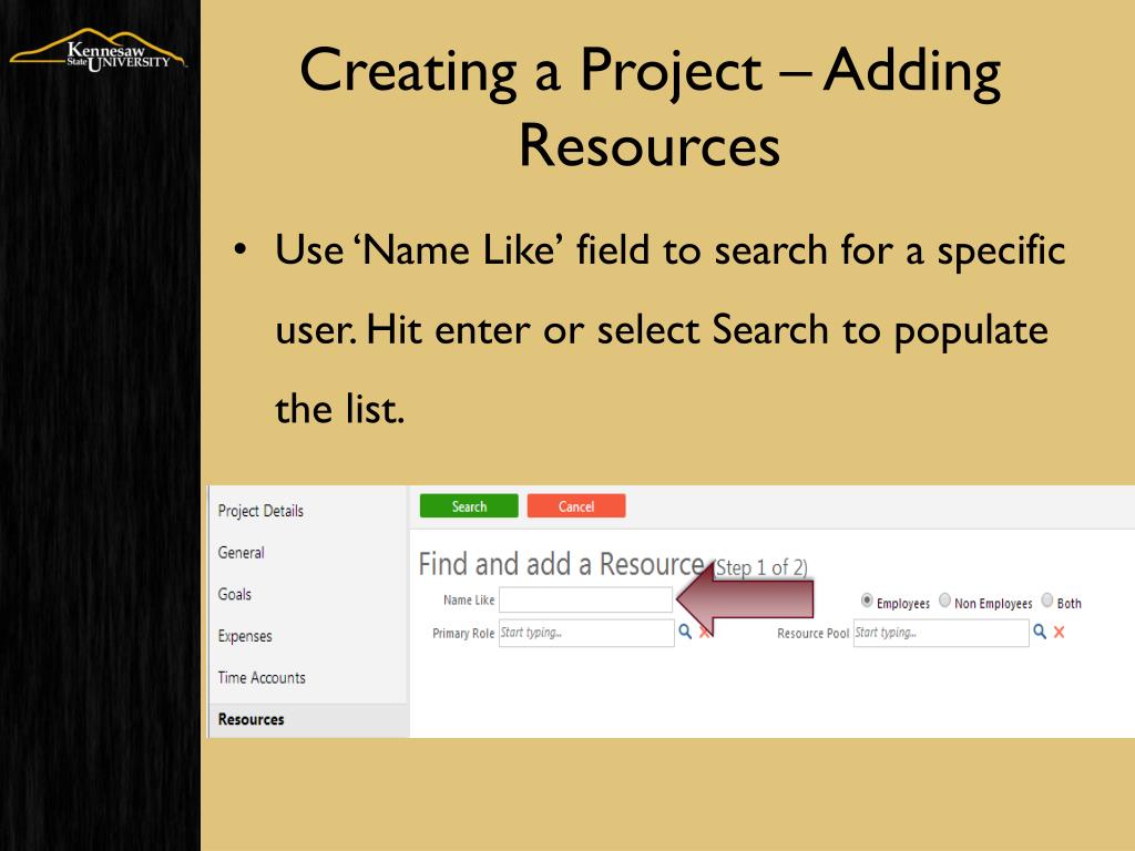 Creating a Project – Adding Resources • Use ‘Name Like’ field to search for a specific user. Hit enter or select Search to populate the list.